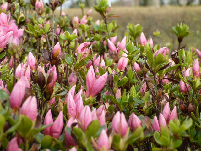 まだ小さいけど一人前の八重桜(?)濃いピンクがきれい