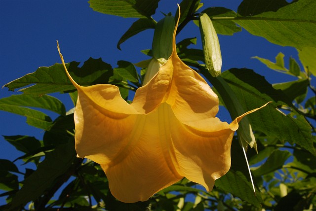 見上げると、真っ青な宇宙から降りてくるように下を向いて羽を広げる謎の花・・・
